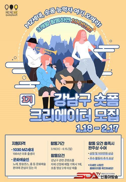 MZ¼¼´ë Áß 1984³â~2015³â»ýÀÌ ÁÖ¿ä ¸ðÁý´ë»óÀÌÁö¸¸, ³ë·¡¡¤´í½º µî ¹®È­¿¹¼ú¿¡ Àç´ÉÀÌ ÀÖ´Â »ç¶÷Àº ´©±¸³ª Âü¿©ÇÒ ¼ö ÀÖ½À´Ï´Ù. °­³²±¸´Â ¼±¹ßµÈ Å©¸®¿¡ÀÌÅͰ¡ Á÷Á¢ ±âȹ¡¤Á¦ÀÛÇÑ °­³²±¸ °ü·Ã ¼ôÆû ÄÜÅÙÃ÷¸¦ È«º¸Çϰí, À̸¦ ÅëÇØ ±¸¹Î°ú Àû±ØÀûÀ¸·Î ¼ÒÅëÇÒ °èȹÀÔ´Ï´Ù.