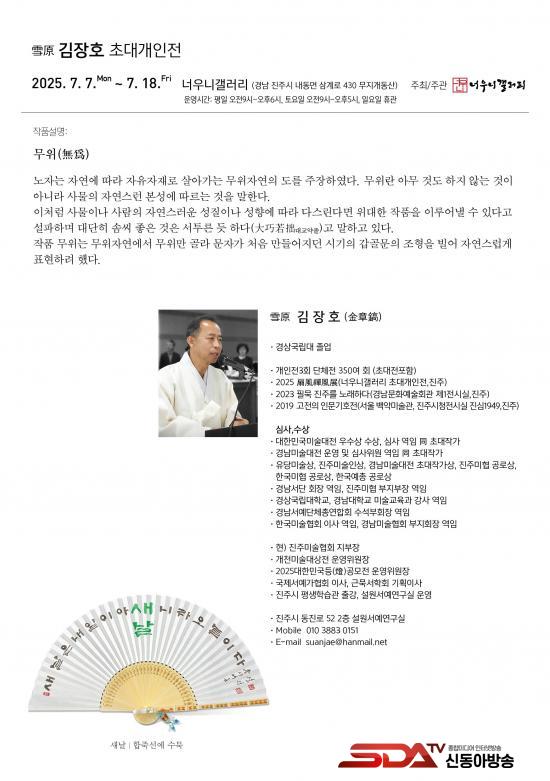 ¼³¿ø ±èÀåÈ£ ÀÛ°¡´Â ´ëÇѹα¹¹Ì¼ú´ëÀü ÃÊ´ëÀÛ°¡·Î, ÇöÀç ÁøÁֽà Æò»ýÇнÀ°ü¿¡¼­ ¼­¿¹ °­»ç·Î Ȱµ¿Çϰí ÀÖ´Ù. À̹ø Àü½Ã¿¡¼­´Â ¼­¿¹ ÀÛǰ 20¿© Á¡À» ¼±º¸À̸ç, ÀÛ°¡ ƯÀ¯ÀÇ ¼­Ã¼¸¦ ¹ÙÅÁÀ¸·Î ÀÚ¿¬ÀÇ ¼ø¸®¿¡ µû¸£´Â »îÀÇ ÀÌÄ¡¿Í µ¿¾ç öÇÐÀÇ ±íÀ̸¦ ´ã¾Æ³½ ÀÛǰ ¼¼°è¸¦ ÆîÄ£´Ù.
