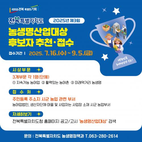 µµ´Â ¡®2025³â Á¦3ȸ ÀüºÏ³ó»ý¸í»ê¾÷´ë»ó¡¯¼ö»ó Èĺ¸ÀÚ¸¦ 7¿ù 16ÀϺÎÅÍ 9¿ù 5ÀϱîÁö °¢ ½Ã±º ³ó¾÷ºÎ¼¸¦ ÅëÇØ Á¢¼öÇÑ´Ù°í ¹àÇû´Ù.