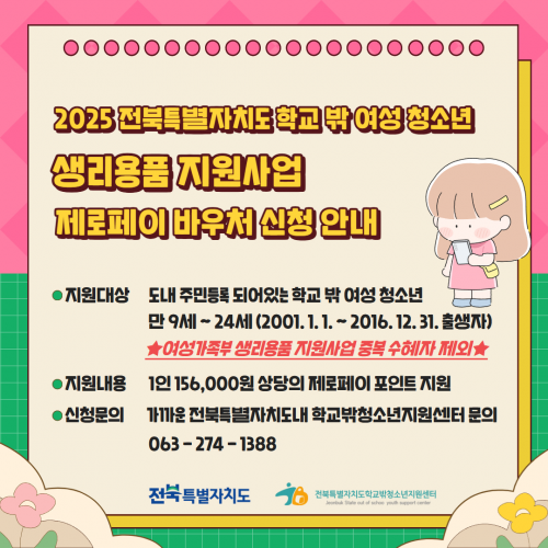 ÀÌ »ç¾÷Àº µµ³» °ÅÁÖÇÏ´Â ¸¸ 9~24¼¼(2001. 1. 1. ~ 2016. 12. 31. Ãâ»ýÀÚ)±îÁöÀÇ Çб³ ¹Û ¿©¼ºÃ»¼Ò³â 600¸íÀ» ´ë»óÀ¸·Î Çϸç, ¿©¼º°¡Á·ºÎ°¡ ¿î¿µ ÁßÀÎ Àú¼ÒµæÃþ ´ë»ó ¿©¼ºÃ»¼Ò³â »ý¸®¿ëǰ ¹Ù¿ìó »ç¾÷°ú´Â Áߺ¹Áö¿øÀÌ ºÒ°¡ÇÏ´Ù.