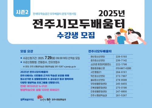 ¼ö°­À» Èñ¸ÁÇÏ´Â ½Ã¹ÎÀº ÀüÁÖ½ÃÆò»ýÇнÀ°ü ´©¸®Áý(e.jeonju.go.kr)À» ÅëÇØ ¼±Âø¼ø ½ÅûÇÒ ¼ö ÀÖÀ¸¸ç, °¢ °­Áº°·Î ÃÖ¼Ò ¸ðÁý Àοø(10¸í) ¹Ì´Þ ½Ã Æó°­µÉ ¼ö ÀÖ´Ù.