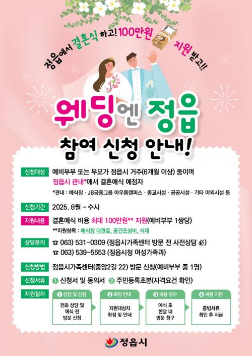 ¡®¿þµù¿£ Á¤À¾¡¯Àº Á¤À¾¿¡¼ °áÈ¥½ÄÀ» ¿Ã¸®´Â ½ÅÈ¥ºÎºÎ¿¡°Ô ÃÖ´ë 100¸¸¿øÀÇ ¿¹½Ä ºñ¿ëÀ» Áö¿øÇÏ´Â ½Å±Ô ½ÃÃ¥À¸·Î, »ýȰÀα¸ À¯ÀÔ°ú Áö¿ª°æÁ¦ Ȱ¼ºÈ¸¦ µµ¸ðÇϱâ À§ÇÑ ÃëÁö·Î ¸¶·ÃµÆ´Ù. ½Åû ´ë»óÀº º»ÀÎ ¶Ç´Â ºÎ¸ð°¡ Á¤À¾½Ã¿¡ 6°³¿ù ÀÌ»ó °ÅÁÖÇÏ°í °ü³» ¿¹½ÄÀå¿¡¼ °áÈ¥ÇÏ´Â °æ¿ì´Ù.
