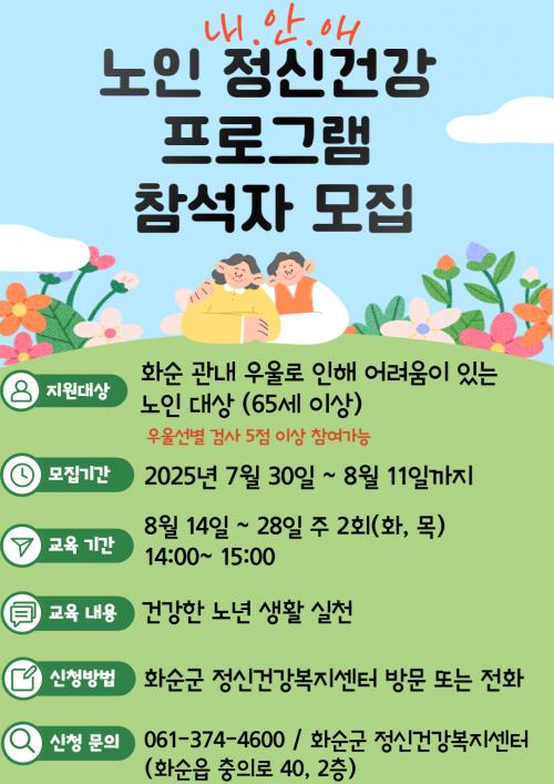 ÇÁ·Î±×·¥Àº 8. 14.ºÎÅÍ 8. 28.±îÁö ÁÖ 2ȸ, ÃÑ 5ȸ±â·Î ¿î¿µµÈ´Ù. Âü¿© ´ë»óÀº È­¼ø °ü³» ÁÖ¹ÎÀ¸·Î¼­, ¿ì¿ï·Î ÀÎÇØ ¾î·Á¿òÀÌ ÀÖ´Â 65¼¼ ÀÌ»ó ³ëÀÎÀ̸ç, ¼±Âø¼øÀ¸·Î 15¸íÀ» ¸ðÁýÇÑ´Ù.