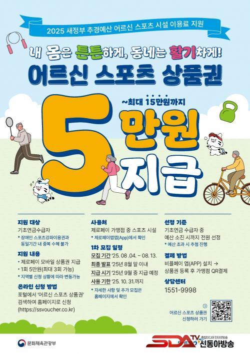 ÀÌ »ç¾÷Àº ¹®È­Ã¼À°°ü±¤ºÎ °Ç°­º¹Áö»ç¾÷ÀÇ ÀÏȯÀ¸·Î, Àú¼Òµæ ¾î¸£½Åµé¿¡°Ô ½ºÆ÷Ã÷½Ã¼³ ÀÌ¿ë·á¸¦ Áö¿øÇϸç, 1Àδç 1ȸ 5¸¸ ¿ø, ¿¹»ê »óȲ¿¡ µû¶ó 1Àδç ÃÖ´ë 3ȸ 15¸¸ ¿ø±îÁö Á¦·ÎÆäÀÌ ¸ð¹ÙÀÏ »óǰ±ÇÀ¸·Î Áö±ÞµÈ´Ù.