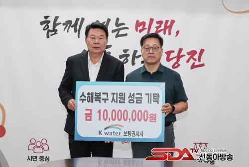 [½Åµ¿¾Æ¹æ¼Û=ÀÌÀçö±âÀÚ] ´çÁø½Ã(½ÃÀå ¿À¼ºÈ¯)´Â 5ÀÏ ¿ÀÀü, K-water º¸·É±ÇÁö»ç(Áö»çÀå ¹Ú±Ô¿µ)·ÎºÎÅÍ ¼öÇØº¹±¸ Áö¿øÀ» À§ÇÑ ¼º±Ý 1000¸¸ ¿øÀ» Àü´Þ¹Þ¾Ò´Ù.