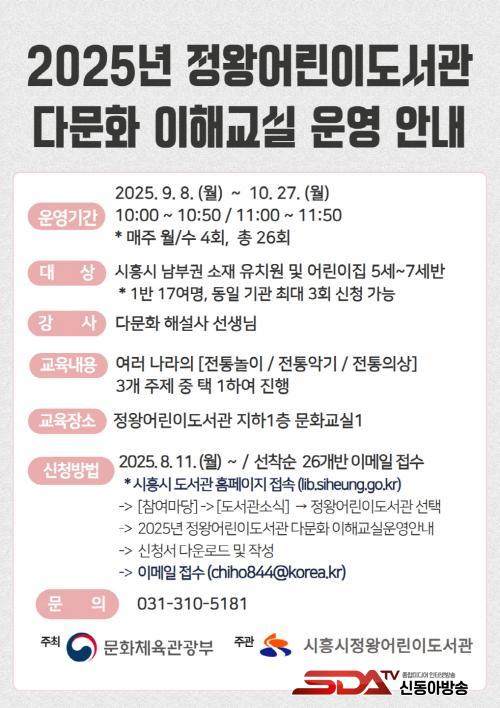 [½Åµ¿¾Æ¹æ¼Û ½ÃÈï½Ã=À̽ŵ¿±âÀÚ] ½ÃÈï½ÃÁ¤¿Õ¾î¸°À̵µ¼­°üÀº ¿À´Â 9¿ù 8ÀϺÎÅÍ 10¿ù 27ÀϱîÁö °ü³» À¯¾Æ±³À°±â°ü¿¡ µî¿ø ÁßÀÎ 5~7¼¼ ¾î¸°À̸¦ ´ë»óÀ¸·Î ¡®2025³â ÇϹݱ⠴ٹ®È­ ÇÁ·Î±×·¥¡¯ÀÇ ÀÏȯÀÎ ¡®´Ù¹®È­ ÀÌÇØ±³½Ç¡¯À» ¿î¿µÇÑ´Ù.