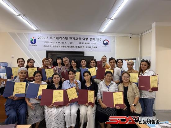 Çѱ¹¾î±³À° ¿¬¼ö¿¡ Âü°¡ÇÑ ¿ìÁŰ½ºÅº ÇöÁö ±³¿øµéÀÌ À̼öÁõÀ» µé°í ±â³ä»çÁøÀ» Âï°í ÀÖ´Ù.