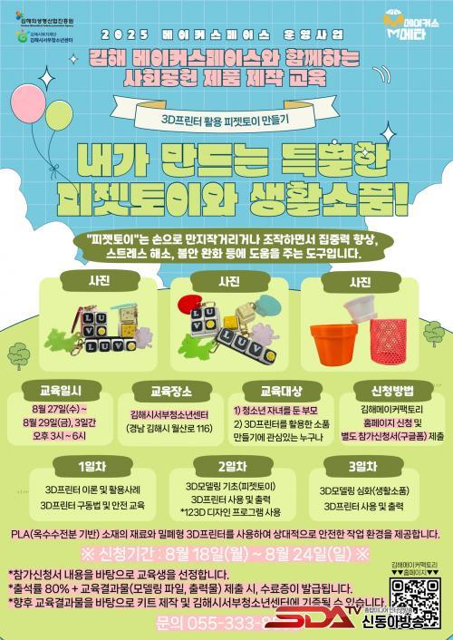 3DÇÁ¸°ÅÍ È°¿ë ÇÇÁ¬ÅäÀÌ ¸¸µé±â ±³À°Àº 8¿ù 27ÀϺÎÅÍ 29ÀϱîÁö, ±èÇØ½Ã¼ºÎû¼Ò³â¼¾ÅÍ¿¡¼ 3Àϰ£ ¿î¿µµÇ¸ç, û¼Ò³â Àڳฦ µÐ ºÎ¸ð ¶Ç´Â 3D¸ðµ¨¸µ¿¡ °ü½É ÀÖ´Â ´©±¸³ª ½ÅûÇÒ ¼ö ÀÖ´Ù.