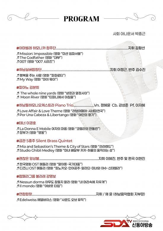 ÇÁ·Î±×·¥Àº ¡¸¹Ì¼Ç Àӯļ­ºí¡¹, ¡¸´ëºÎ¡¹, ¡¸007¡¹, ¡¸¿©ÀÎÀÇ Çâ±â¡¹, ¡¸¶ó¶ó·£µå¡¹, ¡¸»ç¿îµå ¿Àºê ¹ÂÁ÷¡¹ µî ¼¼°èÀûÀ¸·Î »ç¶û¹Þ´Â ¿µÈ­À½¾ÇºÎÅÍ ¡¸¸»¾ÆÅ桹, ¡¸±¹°¡´ëÇ¥¡¹ µî Çѱ¹¿µÈ­ À½¾Ç, ±×¸®°í µðÁî´Ï ¾Ö´Ï¸ÞÀÌ¼Ç ¸í°î±îÁö ¾Æ¿ì¸£¸ç, ³²³à³ë¼Ò ´©±¸³ª Áñ±æ ¼ö ÀÖ´Â ±¸¼ºÀ¸·Î ¸¶·ÃµÇ¾ú´Ù.