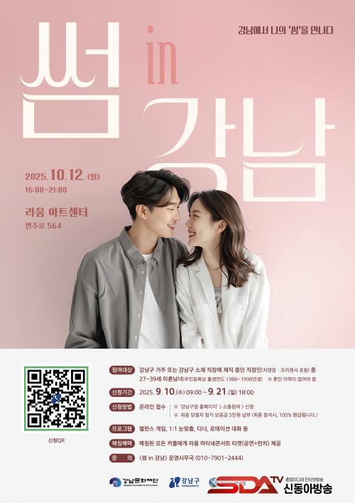 Âü°¡ ´ë»óÀº °­³²±¸¿¡ °ÅÁÖÇϰųª Á÷ÀåÀ» µÐ 27¼¼~39¼¼(1998~1986³â»ý)ÀÇ ¹ÌÈ¥³²³à·Î, ³²³à °¢ 50¸í¾¿ ÃÑ 100¸íÀ» ¸ðÁýÇÑ´Ù. ÀÚ¿µ¾÷ÀÚ, ÇÁ¸®·£¼­µµ Áö¿ø °¡´ÉÇÏ´Ù. ½ÅûÀº 9¿ù 10ÀÏ ¿ÀÀü 9½ÃºÎÅÍ 21ÀÏ ¿ÀÈÄ 6½Ã±îÁö °­³²±¸Ã» ȨÆäÀÌÁö(¼ÒÅëÂü¿© > ½Åû > ½æin°­³²)¿¡¼­ ÇÏ¸é µÈ´Ù.
