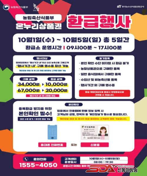 Çà»ç ±â°£ µ¿¾È ±¹³»»ê ½Å¼± ³ó¡¤Ãà»ê¹°À» ±¸¸ÅÇÑ ¼ÒºñÀÚ´Â ±¸¸Å ±Ý¾×¿¡ µû¶ó ÃÖ´ë 30% À̳»¿¡¼­ 1Àδç ÃÖ´ë 2¸¸ ¿ø±îÁö ¿Â´©¸®»óǰ±ÇÀ» ȯ±Þ¹ÞÀ» ¼ö ÀÖÀ¸¸ç, ±¸¸Å±Ý¾× 3¸¸ 4õ ¿ø ÀÌ»ó 6¸¸ 7õ ¿ø ¹Ì¸¸Àº 1¸¸ ¿ø, 6¸¸ 7õ ¿ø ÀÌ»óÀº 2¸¸ ¿øÀÌ È¯±ÞµÇ°í, ¿¹»ê ¼ÒÁø ½Ã Çà»ç´Â Á¶±â Á¾·áµÉ ¼ö ÀÖ´Ù.