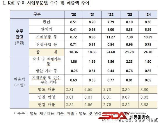 ÇÑÆí KAI´Â ¹æ»ê ¼öÃâ È®´ë¸¦ ±â¹ÝÀ¸·Î ¾ÈÁ¤ÀûÀÎ ¼ºÀå¼¼¸¦ À̾°í ÀÖ´Ù. 2024³â ÃÑ ¼öÁÖÀܰí´Â 24.7Á¶ ¿øÀ¸·Î »ç»ó ÃÖ´ëÄ¡¸¦ ±â·ÏÇßÀ¸¸ç, ¼¼ºÎÀûÀ¸·Î´Â ¹æ»ê 8.36Á¶ ¿ø, ¿ÏÁ¦±â 5.29Á¶ ¿ø, ±âüºÎǰ 10.29Á¶ ¿ø, À§¼º»ç¾÷ 0.75Á¶ ¿øÀ¸·Î ±¸¼ºµÈ´Ù. ƯÈ÷ ¿ÏÁ¦±â ºÎ¹®Àº 2020³â 0.41Á¶ ¿ø¿¡¼ 2024³â 5.29Á¶ ¿øÀ¸·Î 12¹è ÀÌ»ó ±ÞÁõÇØ °ý¸ñÇÒ ¸¸ÇÑ ¼ºÀåÀ» º¸¿´´Ù.