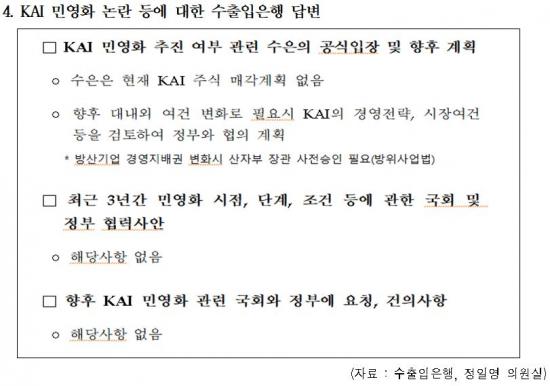 ¼öÃâÀÔÀºÇàÀº ÀÚ·á¿¡¼ ¡°ÇöÀç KAI ÁÖ½Ä ¸Å°¢ °èȹÀº ¾ø´Ù¡±¸ç, ¡°ÇâÈÄ ´ë³»¿Ü ¿©°Ç º¯È¿¡ µû¶ó ÇÊ¿ä½Ã KAIÀÇ °æ¿µÀü·«°ú ½ÃÀå »óȲÀ» °ËÅäÇØ Á¤ºÎ¿Í ÇùÀÇÇÒ °Í¡±À̶ó°í ¹àÇû´Ù. ƯÈ÷ ÃÖ±Ù 3³â°£ ¹Î¿µÈ ½ÃÁ¡¡¤´Ü°è¡¤Á¶°Ç µî¿¡ ´ëÇØ ±¹È¸³ª Á¤ºÎ¿Í ÇùÀÇÇÑ »ç·Ê°¡ ÀüÇô ¾ø¾ú°í, ¾ÕÀ¸·Î ¹Î¿µÈ °ü·Ã ¿äûÀ̳ª °ÇÀÇ»çÇ×µµ ¾ø´Â °ÍÀ¸·Î È®ÀεƴÙ.