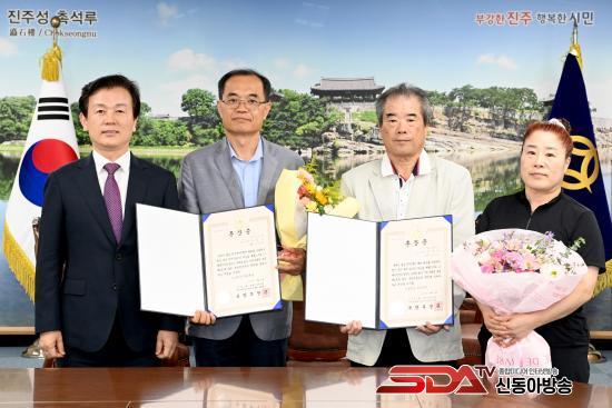 [½Åµ¿¾Æ¹æ¼Û °æ³²ÁøÁÖ=³²±Ã¿µ±â±âÀÚ] ÁøÁֽô 2ÀÏ 6¡¤25ÀüÀï ÂüÀü À¯°øÀÚÀÎ ¡®Íº ±èÆÇ½Ä ÀϺ´¡¯°ú ¡®Íº À±µµ±â ÀϺ´¡¯ÀÇ À¯°¡Á·ÀÎ °íÀεéÀÇ Á¶Ä« ±èÇü¿ø, À±¼º¼ö ¾¾¿¡°Ô °¢°¢ È­¶û¹«°øÈÆÀåÀ» Àü¼öÇß´Ù.