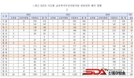 [½Åµ¿¾Æ¹æ¼Û ÀÎõ=À±¹Î½Ä±âÀÚ]´õºÒ¾î¹ÎÁÖ´ç ¹é½Â¾Æ ÀÇ¿ø(±³À°À§¿øÈ¸)ÀÌ °ø°³ÇÑ ¡®ÃÖ±Ù 3³â ½Ãµµº° ±³À°º¹Áö¿ì¼±Áö¿ø»ç¾÷ ÇöȲ¡¯ ÀÚ·á¿¡ µû¸£¸é, ÃÖ±Ù 3³â Àü±¹ ±³À°º¹Áö¿ì¼±Áö¿ø»ç¾÷ ´ë»ó Çб³¡¤Çлý¡¤Àü´ãÀηÂÀÌ Áõ°¡ÇßÁö¸¸, ÀϺΠ±³À°Ã»¿¡¼­´Â Àü´ãÀηÂÀ» °¨ÃàÇÑ °ÍÀ¸·Î µå·¯³µ´Ù.