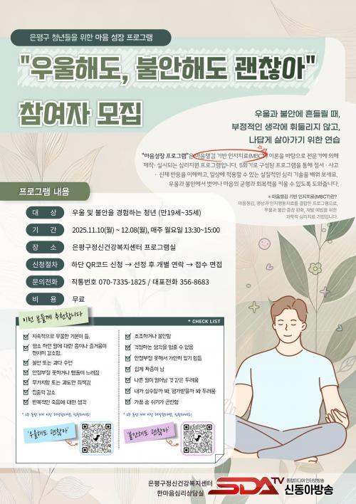 À̹ø ¸¶À½ ¼ºÀå ÇÁ·Î±×·¥Àº ¸¸ 19¼¼ºÎÅÍ 35¼¼ û³âÀ» ´ë»óÀ¸·Î, ¿À´Â 10ÀϺÎÅÍ 12¿ù 8ÀϱîÁö ¸ÅÁÖ ¿ù¿äÀÏ ÁøÇàµÈ´Ù. û³âµéÀÇ Áõ»ó¿¡ µû¶ó ¡ã¿ì¿ïÇØµµ ±¦Âú¾Æ ¡ãºÒ¾ÈÇØµµ ±¦Âú¾Æ ÃÑ 2°³ÀÇ ÇÁ·Î±×·¥ÀÌ °¢ 5ȸÂ÷¾¿ ¿¸°´Ù.