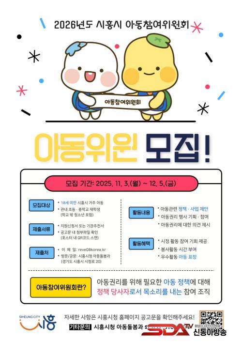 ¸ðÁýÀº ¿À´Â 12¿ù 5ÀϱîÁö ÁøÇàµÇ¸ç, ½ÃÈï½Ã¿¡ °ÅÁÖÇϰųª °ü³» ÃÊÁßÇб³¿¡ ÀçÇÐ ÁßÀÎ ¸¸ 18¼¼ ¹Ì¸¸ÀÇ ¾Æµ¿À̶ó¸é ´©±¸³ª ½ÅûÇÒ ¼ö ÀÖ´Ù. ÃÑ 100¸í Áß ½Å±Ô À§¿ø 57¸í ³»¿Ü¸¦ ¼±¹ßÇϸç, ¼±¹ßµÈ À§¿øµéÀº 2026³â 1¿ùºÎÅÍ 2³â°£ ¡ã¾Æµ¿Á¤Ã¥ ¹× »ç¾÷ ÀÇ°ß Á¦¾È ¡ã¾Æµ¿Ä£È Çà»ç ±âȹ ¹× Âü¿© ¡ã¾Æµ¿ ±Ç¸® È«º¸ ¹× Ä·ÆäÀΠȰµ¿ µîÀ» ¼öÇàÇÏ°Ô µÈ´Ù.