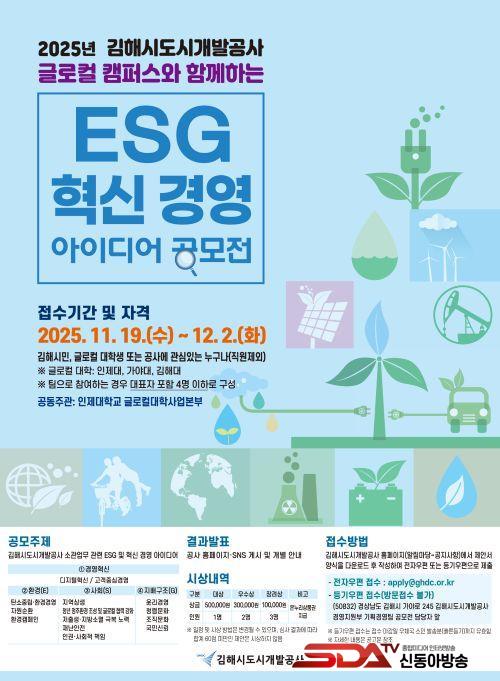 [½Åµ¿¾Æ¹æ¼Û °æ³²±èÇØ=³²±Ã¿µ±â±âÀÚ] ±èÇØ½Ãµµ½Ã°³¹ß°ø»ç(ÀÌÇÏ °ø»ç)°¡ Áö¿ªÀÇ ¹Ì·¡¸¦ ½Ã¹Î°ú û³âÀÌ Á÷Á¢ ¼³°èÇÏ´Â ¡®2025 ESG¡¤Çõ½Å °æ¿µ ¾ÆÀ̵ð¾î °ø¸ðÀü¡¯À» °³ÃÖÇÑ´Ù. °ø¸ðÀüÀº Áö³­ 19ÀϺÎÅÍ 12¿ù 2ÀϱîÁö ÁøÇàµÇ¸ç, ÀÎÁ¦´ëÇб³ ±Û·ÎÄôëÇлç¾÷º»ºÎ¿Í °øµ¿À¸·Î ÃßÁøµÈ´Ù.