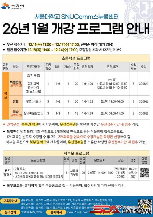 [½Åµ¿¾Æ¹æ¼Û ½ÃÈï½Ã=À̽ŵ¿±âÀÚ] ½ÃÈï½Ã¿Í ¼­¿ï´ëÇб³ÀÇ ±³À°Çù·Â»ç¾÷À¸·Î ÃßÁø ÁßÀÎ ¡®½º´©ÄÞ(SNUComm)¡¯ÀÌ °Ü¿ï¹æÇÐÀ» ¸Â¾Æ ÃʵîÇб³ 4~6ÇгâÀ» ´ë»óÀ¸·Î ¡®¹æÇРƯ°­¡¯ ÇÁ·Î±×·¥À» ¿î¿µÇÑ´Ù.