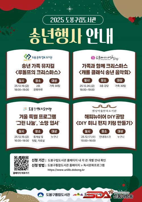 ¿ø´ç¸¶À»ÇÑ¿Áµµ¼­°üÀº 12¿ù 17ÀÏ ¡®DIY ¹Ì´Ï ÆíÁö ۸µ ¸¸µé±â¡¯ Çà»ç¸¦, µµºÀ¹®È­Á¤º¸µµ¼­°üÀº 12¿ù 19ÀÏ ¼Û³â °¡Á· ¹ÂÁöÄà ¡®·çµ¹ÇÁÀÇ Å©¸®½º¸¶½º¡¯ °ø¿¬À», µµºÀ±âÀûÀǵµ¼­°üÀº 12¿ù 19ÀÏ µµ¼­°ü ½Ä¹° ³ª´® ¡®±×¸° ³ª´®¡¯, ¡®µµ¼­°ü¿¡¼­ ¾²´Â »õÇØ ¼Ò¸Á ¿±¼­¡¯ Çà»ç¸¦, µµºÀ¾ÆÀ̳ª¶óµµ¼­°üÀº 12¿ù 26ÀÏ ¡®Ä³·Ñ Ŭ·¡½Ä ¼Û³â À½¾Çȸ¡¯¸¦ ÁøÇàÇÑ´Ù.