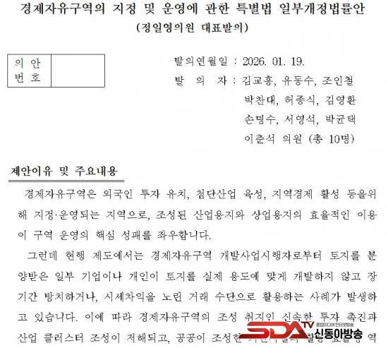[½Åµ¿¾Æ¹æ¼Û ÀÎõ=À±¹Î½Ä±âÀÚ]¼Ûµµ±¹Á¦µµ½Ã Á¤ÀÏ¿µ ±¹È¸ÀÇ¿ø(´õºÒ¾î¹ÎÁÖ´ç, ±¹È¸ ÀçÁ¤°æÁ¦±âȹÀ§¿øÈ¸)Àº 19ÀÏ, °æÁ¦ÀÚÀ¯±¸¿ª ÅäÁö¸¦ ºÐ¾ç¹ÞÀº ±â¾÷ µîÀÌ ÇØ´ç ÅäÁö¸¦ ½ÇÁ¦ ¿ëµµ¿¡ ¸Â°Ô °³¹ßÇÏÁö ¾Ê°í Àå±â°£ ¹æÄ¡ÇÏ´Â ¹®Á¦¸¦ ÇØ°áÇϱâ À§ÇØ ¡¸°æÁ¦ÀÚÀ¯±¸¿ªÀÇ ÁöÁ¤ ¹× ¿î¿µ¿¡ °üÇÑ Æ¯º°¹ý ÀϺΰ³Á¤¹ý·ü¾È¡¹À» ´ëÇ¥¹ßÀÇÇß´Ù°í ¹àÇû´Ù.