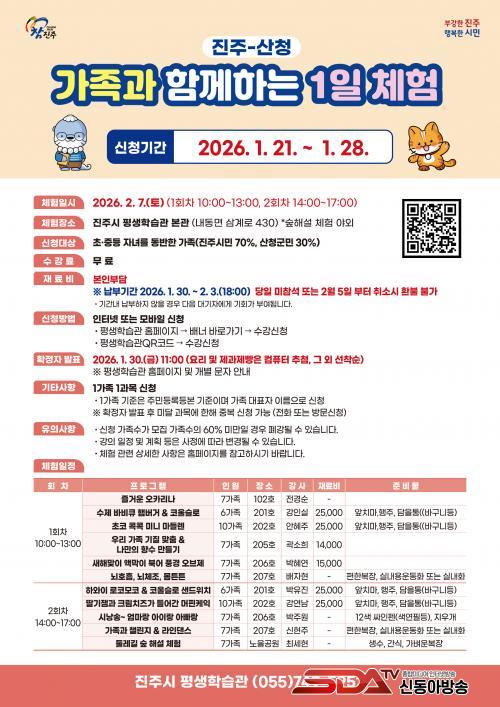 [½Åµ¿¾Æ¹æ¼Û °æ³²ÁøÁÖ=³²±Ã¿µ±â±âÀÚ] ÁøÁֽà Æò»ýÇнÀ°üÀº¡®ÁøÁÖ-»êû °¡Á·°ú ÇÔ²²ÇÏ´Â 1ÀÏ Ã¼Ç衯ÇÁ·Î±×·¥ Âü°¡ÀÚ¸¦ 1¿ù 21ºÎÅÍ 28ÀϱîÁö 8Àϰ£ ¸ðÁýÇÑ´Ù.