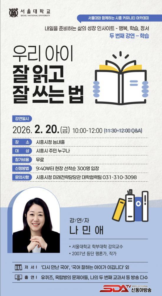 »ó¹Ý±â¿¡´Â ¼­¿ï´ëÇб³ ±³¼öÁøÀÌ Âü¿©ÇÏ´Â ½Ã¹Î ´ë»ó °­¿¬ ÇÁ·Î±×·¥ ¡®½ÃÈï Ä¿¹Â´ÏƼ ¾ÆÄ«µ¥¹Ì¡¯¸¦ 1¿ùºÎÅÍ 5¿ù±îÁö ÃÑ 5ȸ(¿ù 1ȸ) ¿î¿µÇÑ´Ù. °­¿¬Àº ¼­¿ï´ëÇб³ ½ÃÈïÄ·ÆÛ½º ÄÁº¥¼ÇȦ°ú ½Ãû ´Æ³»È¦¿¡¼­ ÁøÇàµÇ¸ç, ½ÃÈï½Ã¹ÎÀº ´©±¸³ª Âü¿©ÇÒ ¼ö ÀÖ´Ù. 2¿ù 20ÀÏ ¿ÀÀü 10½Ã¿¡´Â ½Ãû ´Æ³»È¦¿¡¼­ ³ª¹Î¾Ö ¼­¿ï´ëÇб³ ±³¼öÀÇ °­¿¬ ¡®¿ì¸® ¾ÆÀÌ Àß Àаí Àß ¾²´Â ¹ý¡¯ÀÌ ÁøÇàµÈ´Ù.