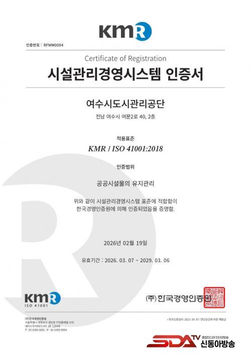 [½Åµ¿¾Æ¹æ¼Û ¿©¼ö=±è±â³² ±âÀÚ] ¿©¼ö½Ãµµ½Ã°ü¸®°ø´Ü(ÀÌ»çÀå ¼Ûº´±¸)Àº Çѱ¹°æ¿µÀÎÁõ¿ø(KMR)À¸·ÎºÎÅÍ ½Ã¼³°ü¸®°æ¿µ½Ã½ºÅÛ(ISO 41001) ÇöÀå½É»ç¸¦ °ÅÃÄ, 19ÀÏ ÀçÀÎÁõÀ» ÃÖÁ¾ ÃëµæÇß´Ù°í ¹àÇû´Ù.