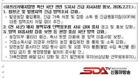 °æ³²µµ´Â ÇâÈÄ »ç·á Á¦Á¶¡¤À¯Å롤±Þ¿© Àü °úÁ¤À» »ó½Ã °ü¸® ü°è·Î ¿î¿µÇϰí, ³ó°¡ Â÷´Ü¹æ¿ª ÀÌÇà ¿©ºÎ¸¦ Áö¼Ó Á¡°ËÇÏ´Â ÇÑÆí ÀÇ½É ½Å°í Áï½Ã Á¤¹Ð °Ë»ç¿Í À̵¿ Á¦ÇÑ Á¶Ä¡¸¦ ½ÃÇàÇÏ´Â µî ¼±Á¦ ´ëÀÀÀ» °ÈÇØ Ãß°¡ ¹ß»ýÀ» Á¶±â¿¡ Â÷´ÜÇÒ ¹æÄ§ÀÌ´Ù. µµ´Â ¡®ÇÑ Ä¡ÀÇ ºóÆ´µµ Çã¿ëÇÏÁö ¾Ê´Â ¹æ¿ª¡¯ ±âÁ¶ ¾Æ·¡ ASF È®»ê ¹æÁö¿¡ ¸ðµç ¿ª·®À» ÁýÁßÇÏ°Ú´Ù°í ¹àÇû´Ù.
