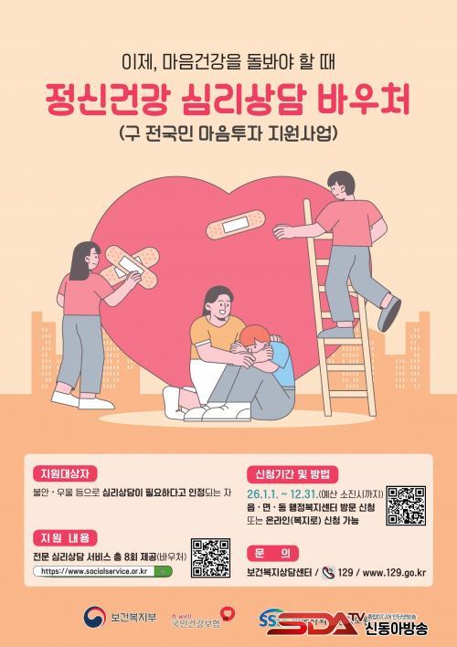 ÀÌ »ç¾÷Àº Á¤¼Àû ¾î·Á¿òÀÌ ÁßÁõ Á¤½ÅÁúȯÀ¸·Î ¾ÇÈÇϱâ Àü¿¡ Á¶±â¿¡ Àü¹® »ó´ãÀ» ¹ÞÀ» ¼ö ÀÖµµ·Ï µ½±â À§ÇÑ °ÍÀÌ´Ù. ±¸¹ÎÀº Àü¹® ½É¸®»ó´ã¼¾ÅÍ¿¡¼ 1´ë1 ´ë¸é »ó´ãÀ» ÃÑ 8ȸ ¹ÞÀ» ¼ö ÀÖÀ¸¸ç, ȸ´ç ÃÖ´ë 8¸¸ ¿ø, ÃÑ 64¸¸ ¿ø±îÁö Áö¿øµÈ´Ù.