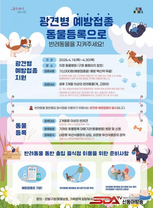Á¶¼º¸í °³²±¸Ã»ÀåÀº ¡°±¤°ßº´ ¿¹¹æÁ¢Á¾Àº ¹Ý·Áµ¿¹°ÀÇ °Ç°Àº ¹°·Ð »ç¶÷°ú ÇÔ²² ¾ÈÀüÇÏ°Ô »ýȰÇϱâ À§ÇÑ ±âº»ÀûÀÎ ¿¹¹æÁ¶Ä¡¡±¶ó¸ç ¡°¹Ý·Áµ¿¹°°ú ÇÔ²² ½Ä´ç°ú °ø¿ø µî ÀÏ»ó °ø°£À» ÀÌ¿ëÇÏ´Â ÀÏÀÌ ´Ã°í ÀÖ´Â ¸¸Å, À̹ø ¹«·á Áö¿ø»ç¾÷À» Àû±Ø Ȱ¿ëÇØ Á¤±âÁ¢Á¾°ú µ¿¹°µî·ÏÀ» ²À ì°ÜÁÖ½Ã±æ ¹Ù¶õ´Ù¡±°í ¸»Çß´Ù.