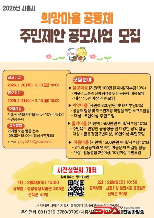 [½Åµ¿¾Æ¹æ¼Û ½ÃÈï½Ã=À̽ŵ¿±âÀÚ] ½ÃÈï½Ã´Â ÁÖ¹ÎÀÌ ÁÖµµÇÏ´Â ¸¶À»°øµ¿Ã¼ Ȱ¼ºÈ­¸¦ À§ÇØ ¡®2026³â ½ÃÈï½Ã Èñ¸Á¸¶À»°øµ¿Ã¼ ÁÖ¹ÎÁ¦¾È °ø¸ð»ç¾÷¡¯À» ÃßÁøÇϰí, ½Ã¹ÎµéÀÇ ÀÌÇØ¸¦ µ½±â À§ÇÑ ±Ç¿ªº° »çÀü¼³¸íȸ¸¦ ´ÙÀ½ ´Þ ³²ºÎ±Ç°ú ÁߤýºÏºÎ±ÇÀ¸·Î ³ª´²¼­ °³ÃÖÇÑ´Ù.