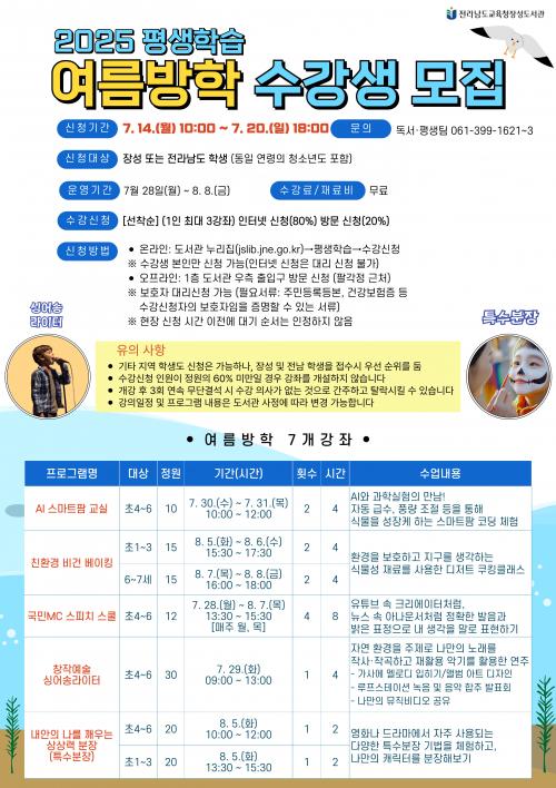 [½Åµ¿¾Æ¹æ¼Û Àü³²À强=À̽ŵ¿±âÀÚ] Àü¶ó³²µµ±³À°Ã»À强µµ¼­°üÀº ¿©¸§¹æÇÐÀ» ¸Â¾Æ Áö¿ª ÃʵîÇлý°ú û¼Ò³âÀ» ´ë»óÀ¸·Î ÀÚ¾Æ Ç¥Çö°ú ¹®È­¿¹¼ú °¨¼ö¼º ÇԾ翡 ÃÊÁ¡À» ¸ÂÃá Àڱ⎻öÀÇ ±âȸ¸¦ Á¦°øÇϱâ À§ÇØ¡®2025 ¿©¸§¹æÇÐ Æò»ýÇнÀ ÇÁ·Î±×·¥¡¯À» ¿î¿µÇÑ´Ù. ¿î¿µ °­Á´¡¦