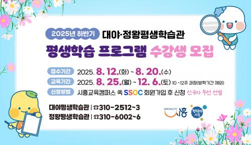 [½Åµ¿¾Æ¹æ¼Û ½ÃÈï½Ã=À̽ŵ¿±âÀÚ]½Ã¹ÎÀÇ Æò»ýÇнÀÀ» Ã¥ÀÓÁö´Â ½ÃÈï½Ã ´ë¾ß¤ýÁ¤¿ÕÆò»ýÇнÀ°ü¿¡¼­ 2025³â ÇÏ¹Ý±â Æò»ýÇнÀÇÁ·Î±×·¥ ¼ö°­»ýÀ» ¸ðÁýÇÑ´Ù. À̹ø ÇϹݱâ ÇÁ·Î±×·¥Àº ¿À´Â 8¿ù 25ÀϺÎÅÍ 10~12ÁÖ°£ ¿î¿µµÇ¸ç, ¿¬·É°ú ¼ö¿ä¸¦ ¹Ý¿µÇÑ ½Ç¿ëÀûÀÌ°í ´Ùä·Î¿î °­Á·Π±¸¡¦