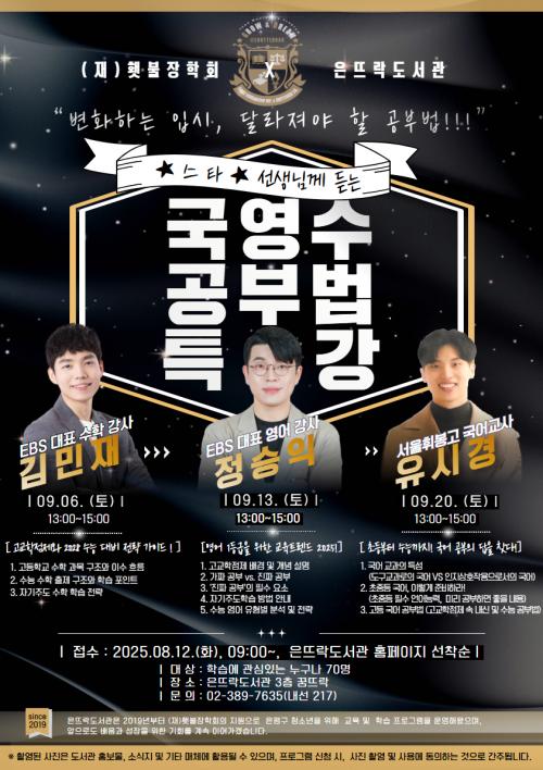 [½Åµ¿¾Æ¹æ¼Û ÀºÆò±¸=À̽ŵ¿±âÀÚ] ¼­¿ï ÀºÆò±¸´Â ±¸¸³ Àº¶ß¶ôµµ¼­°ü¿¡¼­ ¡®½ºÅ¸¡Ú¼±»ý´Ô²² µè´Â ±¹¿µ¼ö °øºÎ¹ý Ư°­¡¯À» ¿î¿µÇÑ´Ù°í ¹àÇû´Ù. À̹ø Ư°­Àº ¿À´Â 9¿ù 6ÀϺÎÅÍ 20ÀϱîÁö ¸ÅÁÖ Åä¿äÀÏ ¿ÀÈÄ 1½ÃºÎÅÍ 3½Ã±îÁö Àº¶ß¶ôµµ¼­°ü¿¡¼­ ÃÑ 3ȸ¿¡ °ÉÃÄ ÁøÇàµÈ´Ù. °ú¸ñ¡¦