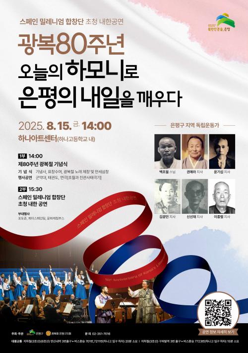 [½Åµ¿¾Æ¹æ¼Û ÀºÆò±¸=À̽ŵ¿±âÀÚ] ¼­¿ï ÀºÆò±¸´Â ¿À´Â 15ÀÏ ±¤º¹ÀýÀ» ¸Â¾Æ ¡®Á¦80Áֳ⠱¤º¹Àý ±â³ä½Ä ¹× Ưº°°ø¿¬¡¯À» °³ÃÖÇÑ´Ù°í ¹àÇû´Ù. ¿ÃÇØ ±¸È£´Â ¡°±¤º¹ 80ÁÖ³â, ¿À´ÃÀÇ Çϸð´Ï·Î ÀºÆòÀÇ ³»ÀÏÀ» ±ú¿ì´Ù¡±À̸ç, ÀºÆòÇÑ¿Á¸¶À»°ú Áø°ü»ç°¡ À§Ä¡ÇÑ Áø°üµ¿ Çϳª¾ÆÆ®¡¦