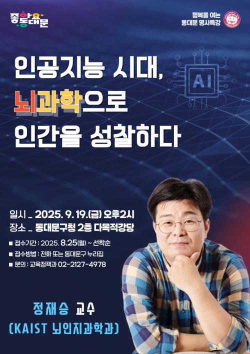 [½Åµ¿¾Æ¹æ¼Û µ¿´ë¹®±¸=À̽ŵ¿±âÀÚ] ¼­¿ï µ¿´ë¹®±¸´Â ¿À´Â 19ÀÏ(±Ý) ¿ÀÈÄ 2½ÃºÎÅÍ 4½Ã±îÁö ±¸Ã» 2Ãþ ´Ù¸ñÀû°­´ç¿¡¼­ ±¸¹Î°ú Á÷¿øµéÀ» ´ë»óÀ¸·Î ¸í»ç Ư°­À» °³ÃÖÇÑ´Ù. À̹ø °­¿¬Àº ±¹³» Àú¸íÇÑ ³ú°úÇÐÀÚÀÌÀÚ ÀÛ°¡ÀÎ Á¤Àç½Â KAIST ³úÀÎÁö°úÇаú ±³¼ö¸¦ ÃÊÃ»ÇØ ¡®ÀΰøÁö¡¦