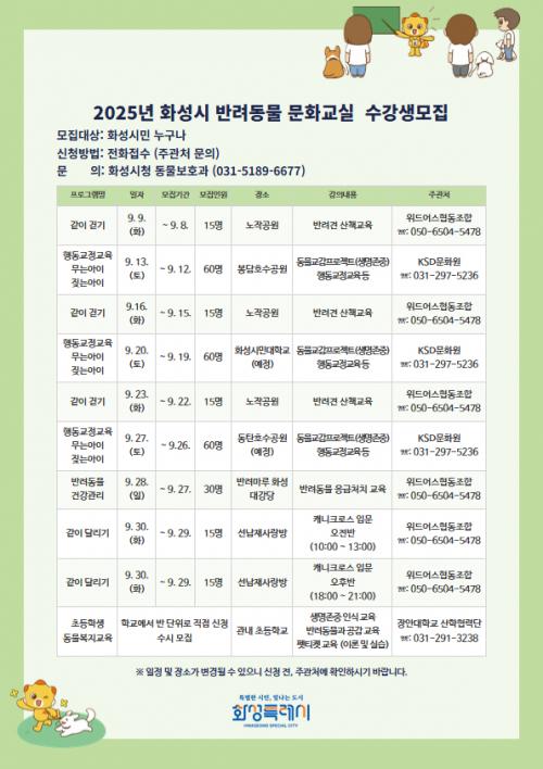 [½Åµ¿¾Æ¹æ¼Û=ÀÌÀçö±âÀÚ] È­¼ºÆ¯·Ê½Ã(½ÃÀå Á¤¸í±Ù)°¡ °Ç°­ÇÏ°í ¼º¼÷ÇÑ ¹Ý·Á ¹®È­¸¦ Á¤ÂøÇϱâ À§ÇÑ ¡®2025³â ¹Ý·Áµ¿¹° ¹®È­±³½Ç¡¯ ¼ö°­»ýÀ» ¸ðÁýÇÑ´Ù°í 4ÀÏ ¹àÇû´Ù. ¹Ý·Áµ¿¹° ¹®È­±³½ÇÀº 9¿ùºÎÅÍ 11¿ù±îÁö ³ëÀÛ°ø¿ø, ºÀ´ãÈ£¼ö°ø¿ø, ¹Ý·Á¸¶·ç È­¼º ´ë°­´ç µî¿¡¼­ ÁøÇàµÅ¡¦