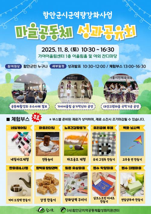 [½Åµ¿¾Æ¹æ¼Û °æ³²ÇÔ¾È=À̽ŵ¿±âÀÚ] ÇԾȱºÀº ¿À´Â 11¿ù 8ÀÏ °¡¾ß¾î¿ï¸²¼¾ÅÍ¿¡¼­ ¡®¸¶À»°øµ¿Ã¼ ¼º°ú°øÀ¯È¸¡¯¸¦ °³ÃÖÇÑ´Ù°í ¹àÇû´Ù. À̹ø Çà»ç´Â ½Ã±º ¿ª·®°­È­»ç¾÷°ú ¸¶À»¸¸µé±â Áö¿ª¿ª·®°­È­»ç¾÷À» ÅëÇØ ¾ç¼ºµÈ 12°³ ¸¶À» ¹× 2°³ µ¿¾Æ¸® ÀÎÀûÀÚ¿øÀÇ È°µ¿ ¼º°ú¸¦ °øÀ¯ÇÏ¡¦