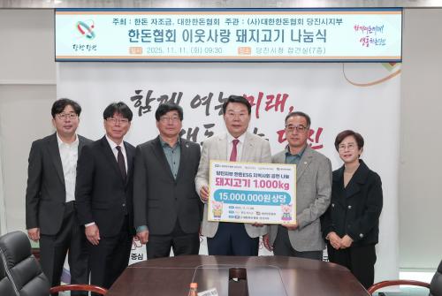 [½Åµ¿¾Æ¹æ¼Û=ÀÌÀçö±âÀÚ] ´ëÇÑÇѵ·Çùȸ ´çÁø½ÃÁöºÎ(ÁöºÎÀå À±ÀÎÇö)°¡ ´çÁø½Ã¿¡ µÅÁö°í±â 1,000kg(1,500¸¸ ¿ø »ó´ç)À» ±âºÎÇÏ¸ç ¡®³ª´® Ãà»ê¡¯ÀÇ ¶æÀ» ½ÇõÇß´Ù. ½Ã¿¡ µû¸£¸é ±âʽÄÀº 11ÀÏ ´çÁø½Ãû Á¢°ß½Ç¿¡¼­ ¿­·ÈÀ¸¸ç, À±ÀÎÇö ÁöºÎÀå°ú ¿À¼ºÈ¯ ´çÁø½ÃÀå µî °ü°èÀÚ¡¦