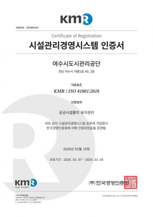 ¿©¼ö½Ãµµ½Ã°ü¸®°ø´Ü, ½Ã¼³°ü¸®°æ¿µ½Ã½ºÅÛ(ISO 41001) ÀçÀÎÁõ Ãëµæ