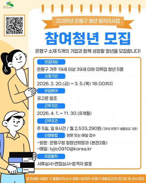 [½Åµ¿¾Æ¹æ¼Û ÀºÆò±¸=À̽ŵ¿±âÀÚ] ¼­¿ï ÀºÆò±¸´Â ¡®2026³â û³â ÀÏÀÚ¸®»ç¾÷¡¯¿¡ Âü¿©ÇÒ Ã»³â 5¸íÀ» ´ÙÀ½ ´Þ 5ÀϱîÁö ¸ðÁýÇÑ´Ù°í ¹àÇû´Ù. û³â ÀÏÀÚ¸®»ç¾÷Àº Áö¿ª ³» ±â¾÷°ú ¿¬°èÇØ û³â¿¡°Ô ½ÇÁúÀûÀÎ ÀÏ °æÇèÀ» Á¦°øÇÏ´Â ±¸ÀÇ ´ëÇ¥ û³â °í¿ë Áö¿ø »ç¾÷ÀÌ´Ù. û³âÀÇ °æ¡¦