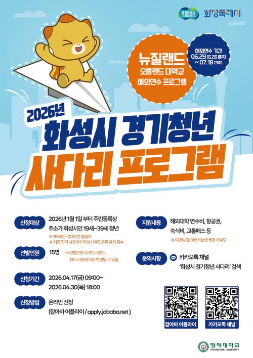[½Åµ¿¾Æ¹æ¼Û=ÀÌÀçö±âÀÚ] È­¼ºÆ¯·Ê½Ã´Â ÇØ¿Ü ¿¬¼ö¸¦ Èñ¸ÁÇϴ û³âµé¿¡°Ô °æÁ¦Àû ºÎ´ã ¾øÀÌ ±Û·Î¹ú °æÇèÀ» ½×À» ¼ö ÀÖ´Â ¡®È­¼º½Ã °æ±âû³â »ç´Ù¸® ÇÁ·Î±×·¥¡¯(¿î¿µ±â°ü: ÆòÅôëÇб³ »êÇÐÇù·Â´Ü) 2±â Âü¿©ÀÚ¸¦ ¸ðÁýÇÑ´Ù. ½Ã´Â 4¿ù 17ÀϺÎÅÍ 4¿ù 30ÀÏ 18½Ã±îÁö 2ÁÖ°£ ¡¦