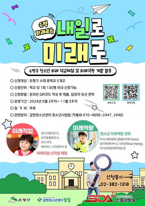 ¡®³»ÀÏ·Î ¹Ì·¡·Î¡¯ ÇÁ·Î±×·¥Àº ÇлçÀÏÁ¤¿¡ µû¶ó ¿À´Â 7¿ùºÎÅÍ 5°³ ÁßÇб³ ´ë»óÀ¸·Î ÃßÁøµÈ´Ù. ½ÅûÀ» ¿øÇÏ´Â Çб³´Â Æ÷½ºÅ͸¦ Âü°íÇØ QRÄÚµå·Î Á¦ÃâÇϰųª ´ã´çÀÚ·Î ÀüÈÇÏ¸é µÈ´Ù. ÇâÈÄ ÇÁ·Î±×·¥ ÁøÇà °á°ú´Â ÀºÆò±¸ °¥Çöû¼Ò³â¼¾ÅÍ ÆäÀ̽ººÏ, ³×À̹ö ºí·Î±×, ÀνºÅ¸±×·¥ µîÀ» ÅëÇØ¼ È®ÀÎÇÒ ¼ö ÀÖ´Ù.