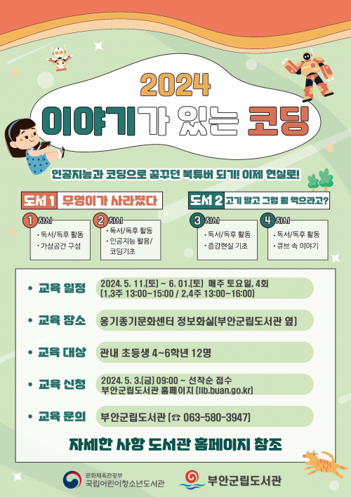 À̾߱Ⱑ ÀÖ´Â ÄÚµù ÇÁ·Î±×·¥Àº ÇлýµéÀÌ Ã¥À» ÀÐÀº ÈÄ »ç¼¿Í ÇÔ²² µ¶ÈÄȰµ¿À» ÇÑ ³»¿ëÀ» ÄÚµùÀ¸·Î Ç¥ÇöÇÏ´Â ¹æ½ÄÀ¸·Î ÁøÇàµÇ¸ç, ÀÚ¼¼ÇÑ »çÇ×Àº ºÎ¾È±º¸³µµ¼°üÀ¸·Î ¹®ÀÇÇÏ¸é µÈ´Ù.