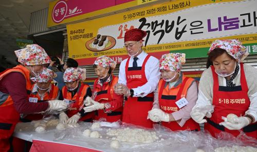 À̳¯ Çà»ç´Â 1980³â 5‧18 ´ç½Ã ½Ê½ÃÀÏ¹Ý ½Ò°ú µ·À» ¸ð¾Æ ½Ã¹Î±ºµé¿¡°Ô ÁÖ¸Ô¹äÀ» ¸¸µé¾î ÁÖ¸ç ÈûÀ» º¸ÅÉ´ø ¾çµ¿½ÃÀå »óÀεé, ¿À¿ù¿ª»ç ¹Ù·Î ¼¼¿ì±â¿Í Á¤½Å°è½Â¿¡ ¾ÕÀå¼°í ÀÖ´Â ¿À¿ù¾î¸Ó´ÏµéÀÌ ÇÔ²²ÇØ Àǹ̸¦ ´õÇß´Ù.