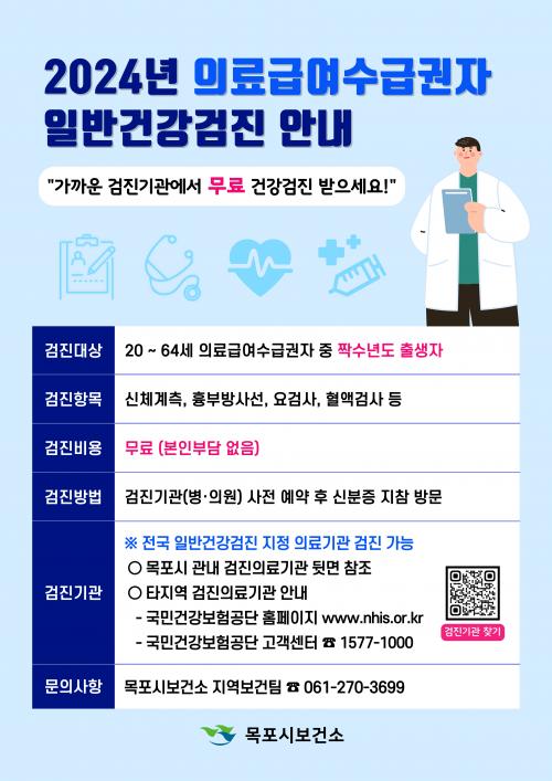 2024³â ¿ÃÇØ ÀÇ·á±Þ¿©¼ö±Þ±ÇÀÚ Áß ÀϹݰǰ°ËÁø ´ë»óÀÚ´Â 20~64¼¼ ¦¼ö³âµµ Ãâ»ýÀÚ·Î, °ËÁø Ç׸ñÀº ½Åü°èÃø, ÈäºÎ¹æ»ç¼±, ¿ä°Ë»ç, Ç÷¾×°Ë»ç µîÀÌ¸ç °ËÁø ºñ¿ëÀº ¹«·á´Ù.