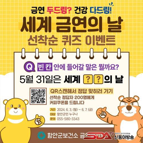 À̺¥Æ®´Â 3ÀϺÎÅÍ ¿À´Â 7ÀϱîÁö ÃÑ 5ÀÏ µ¿¾È ÁøÇàµÇ¸ç ÇԾȱº¿¡ ÁÖ¼ÒÁö¸¦ µÎ°í ÀÖ´Â »ç¶÷À̶ó¸é ´©±¸³ª QRÄڵ忡 Á¢¼ÓÇØ Âü¿©ÇÒ ¼ö ÀÖ´Ù. ÇØ´ç ±â°£ ³» ÄûÁî À̺¥Æ®¿¡ Âü¿©ÇØ ¼¼°è ±Ý¿¬ÀÇ ³¯°ú °ü·ÃµÈ ÄûÁ Ç®¸é Á¤´äÀÚ Áß ¼±Âø¼ø 200¸í¿¡°Ô ¸ð¹ÙÀÏ Ä¿ÇÇ ÄíÆùÀ» Á¦°øÇÒ ¿¹Á¤ÀÌ´Ù.