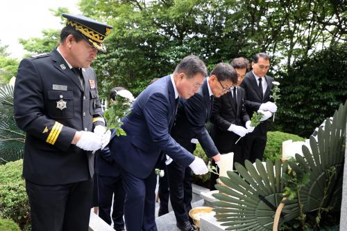 Ãß³ä½Ä¿¡´Â ±è»ê ±º¼ö¸¦ ºñ·ÔÇÏ¿©, ¼»ï¼® ±¹È¸ÀÇ¿ø, ÀÓµ¿Çö ¹«¾È±ºÀÇȸ ºÎÀÇÀå, Àü³²µµ¡¤¹«¾È±ºÀÇȸ ÀÇ¿ø, º¸ÈÆ´ÜüÀå, º¸Èư¡Á·, ±â°ü¡¤»çȸ´ÜüÀå, °ø¹«¿ø µî 250¿© ¸íÀÌ Âü¼®ÇÑ °¡¿îµ¥ °æ°ÇÇÏ°í ¾ö¼÷ÇÑ ºÐÀ§±â ¼Ó¿¡¼ ¼ø±¹¼±¿ÀÇ ¶æÀ» ±â¸®°í Ã߸ðÇß´Ù.