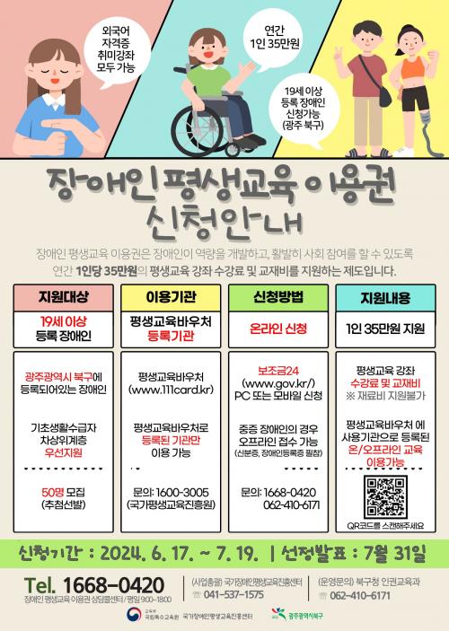 °ø¸ð ¼±Á¤¿¡ µû¶ó ºÏ±¸´Â 19¼¼ ÀÌ»ó µî·Ï Àå¾ÖÀÎ 50¸í¿¡°Ô Æò»ý±³À° °­Á ¼ö°­·á ¹× ±³Àçºñ·Î ¾µ ¼ö ÀÖ´Â Æò»ý±³À° ¹Ù¿ìó¸¦ 1ÀÎ´ç ¿¬°£ ÃÖ´ë 35¸¸ ¿ø±îÁö Áö¿øÇÒ °èȹÀÌ´Ù.